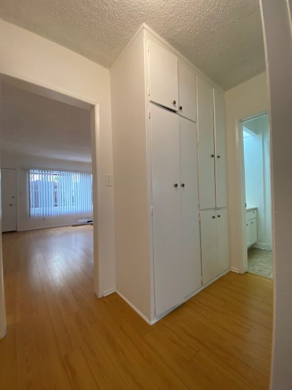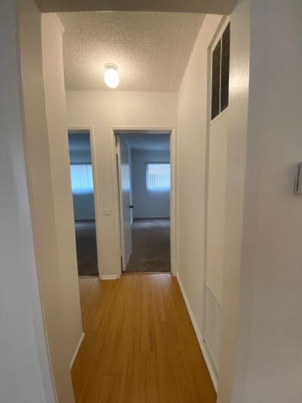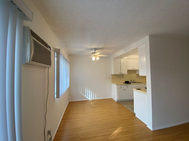 This lower unit comes with gas stove, fridge, blinds, ceiling fan in dining area, wall a/c unit in living room, laminate wood & plank flooring throughout, ceiling fan in dining area, lots of closet space, big walk-in closet off living room, big windows in dining area and living room, non-smoking unit, shared laundry room, one assigned parking space, no pets, close to shopping center & bus line.